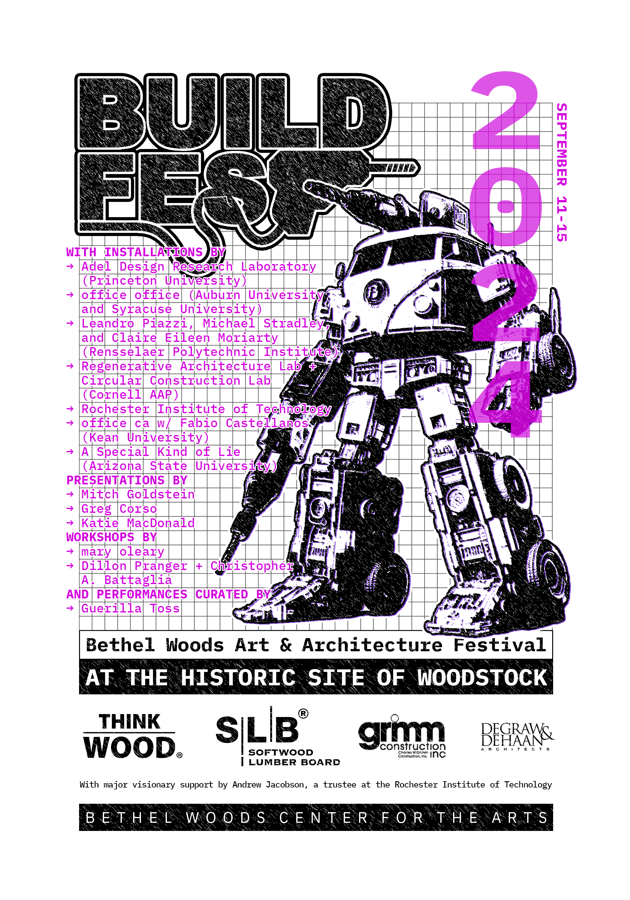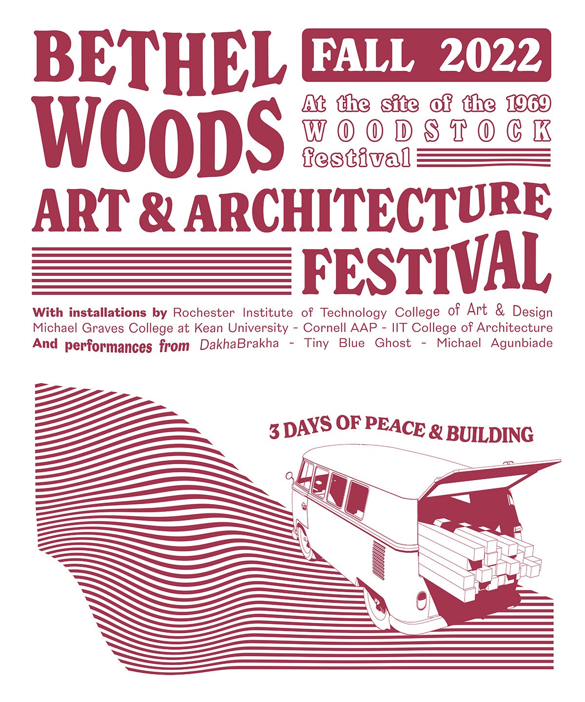 For the next three years, the Bethel Woods Art & Architecture Festival (BuildFest) will build upon its previous success by challenging designers and artists to collaborate on an interdisciplinary series of acts. Each year will build on the previous one, creating an interconnected set of installations, activations, and performances.