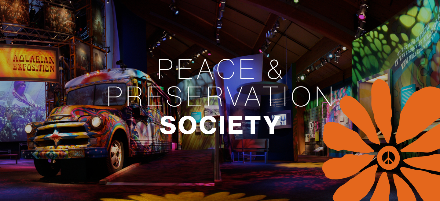 Your Peace & Preservation Society membership protects the legacy of the 1969 Woodstock festival by supporting the Museum, preserving the historic site, and helping us make the world a better place through the power of music and the message of peace.